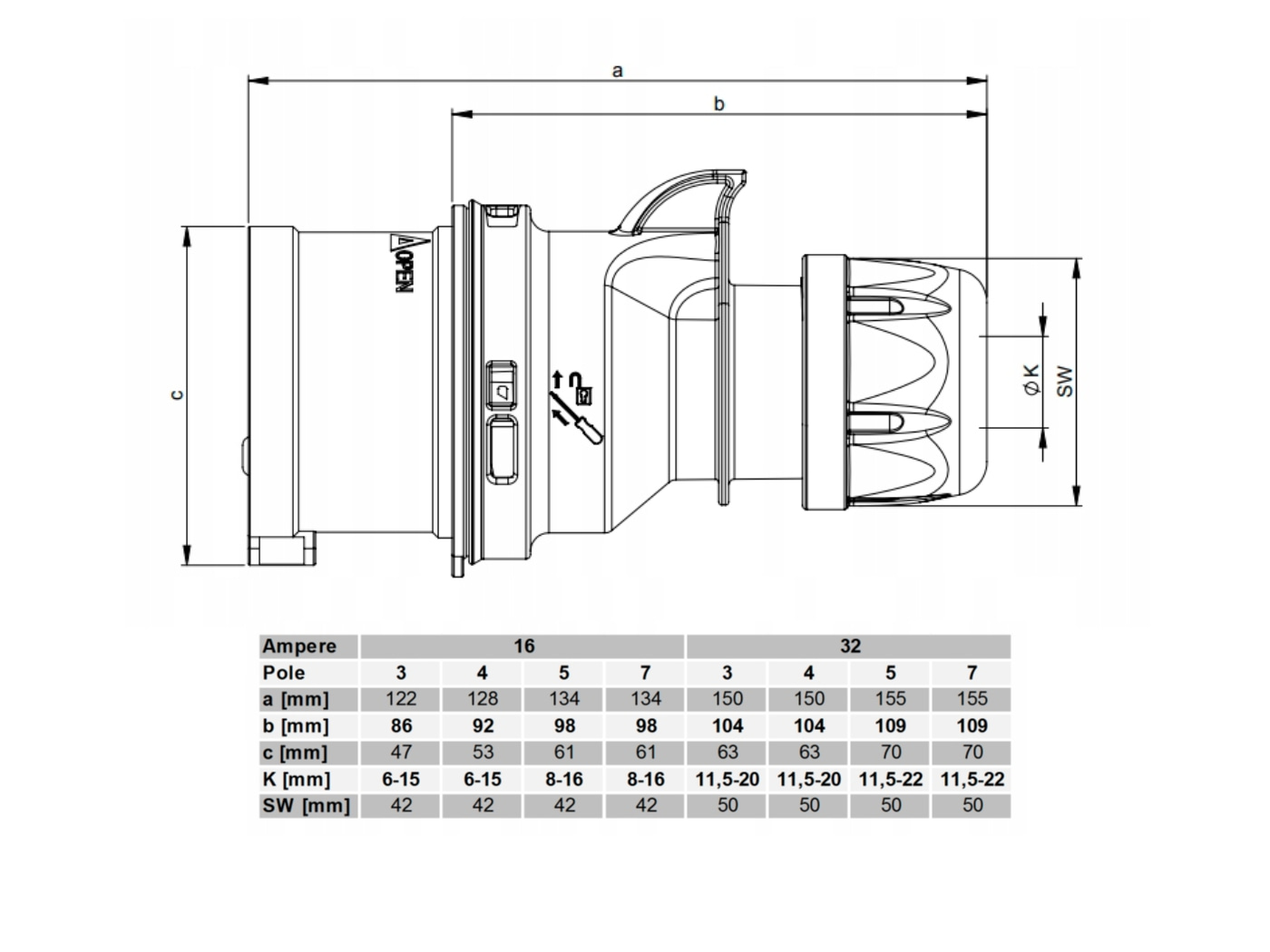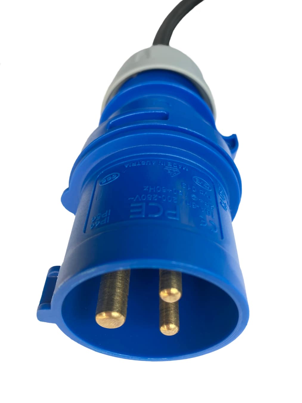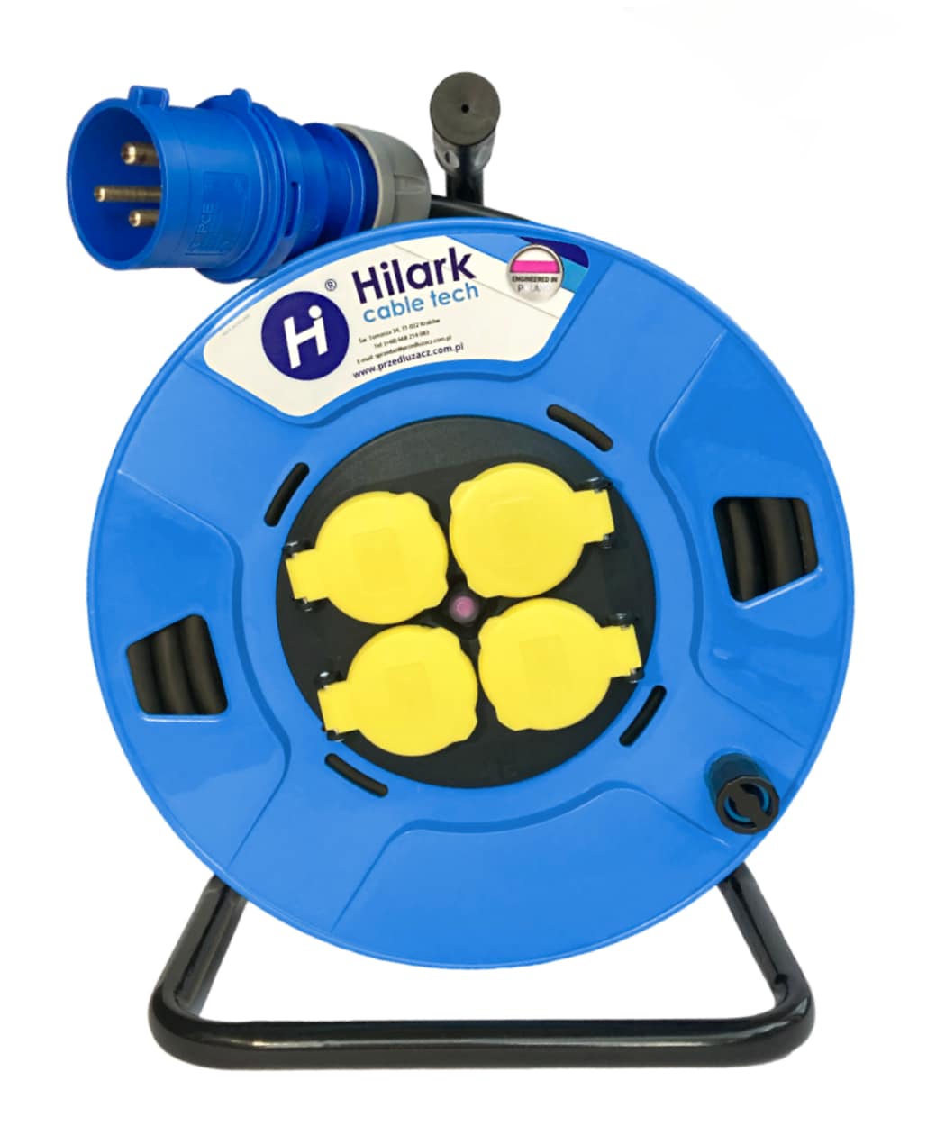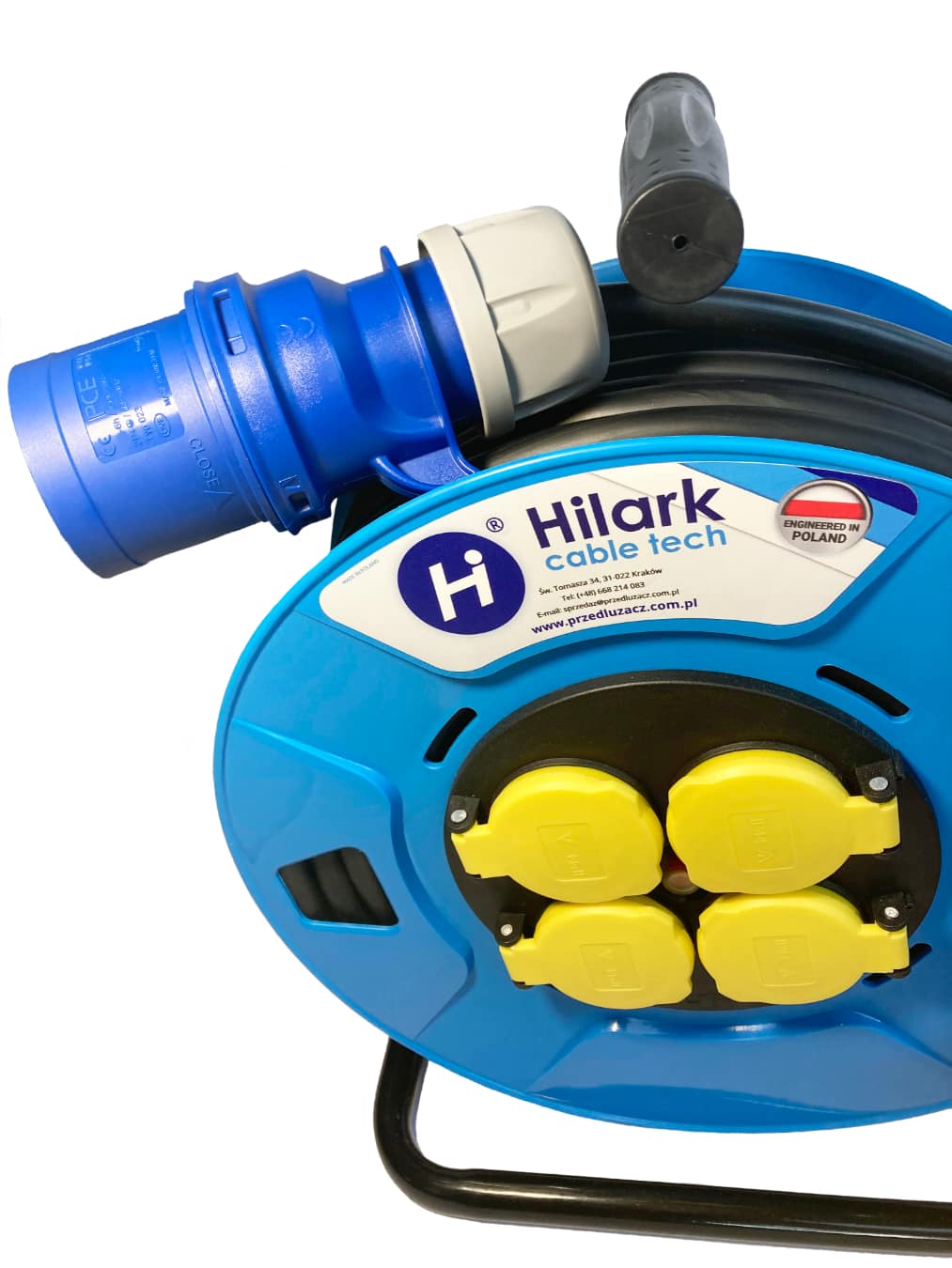 - Adapter siłowy – redukcja z wtyku 16A 3P na 4 gniazda 230V 16A na bębnie