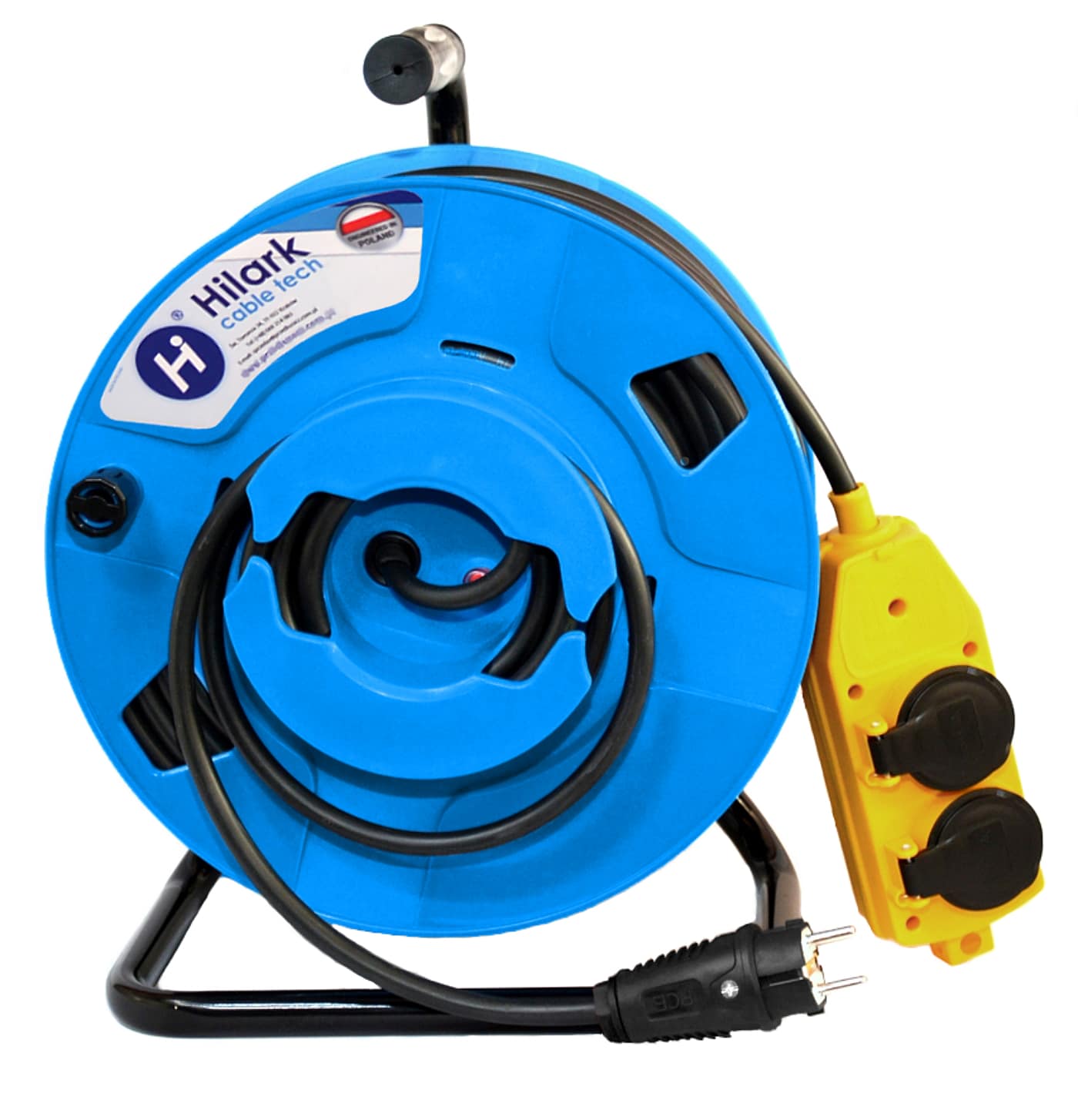 Bęben nie przeszkadza w pracy, jest podpięty bezpośrednio do gniazda na 2m złączu, a rozwijamy przewód zakończony gniazdem.