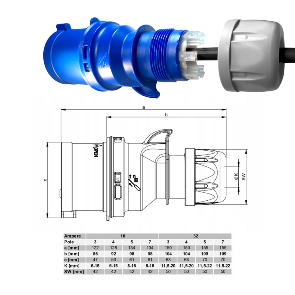 Wtyczka renomowanej marki PCE, o stopniu ochrony: IP44;