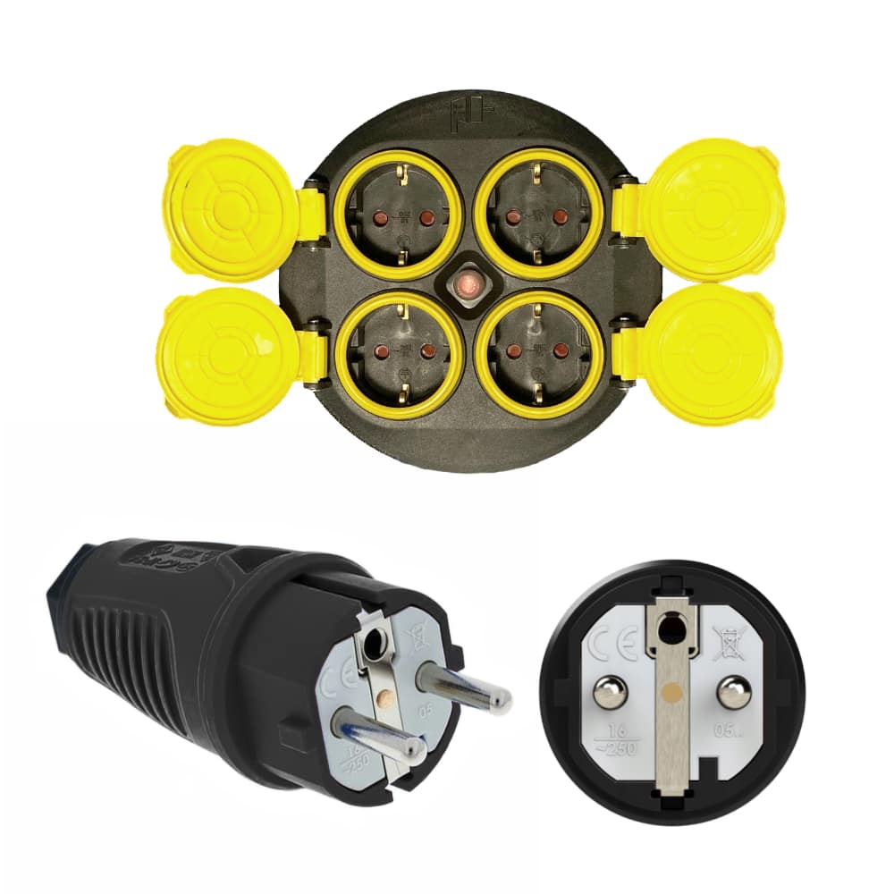 4 wymienne gniazda: 4x230V 16A (Typ F SCHUKO, styki uziemiające) stopień ochrony IP44 (bryzgoszczelne)