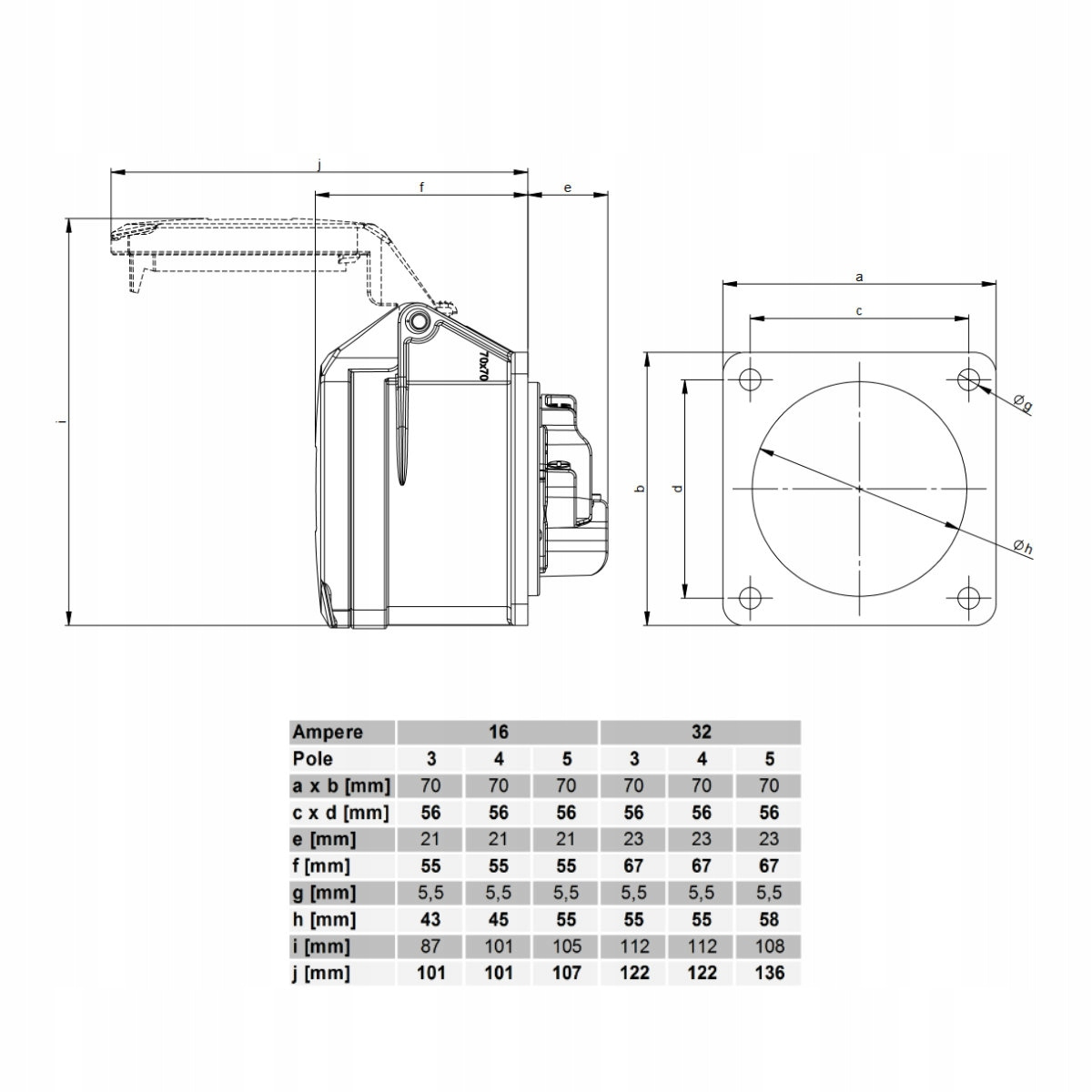 - CEE-gniazdo tablicowe proste (70x70mm) 32A 4p 6h IP44