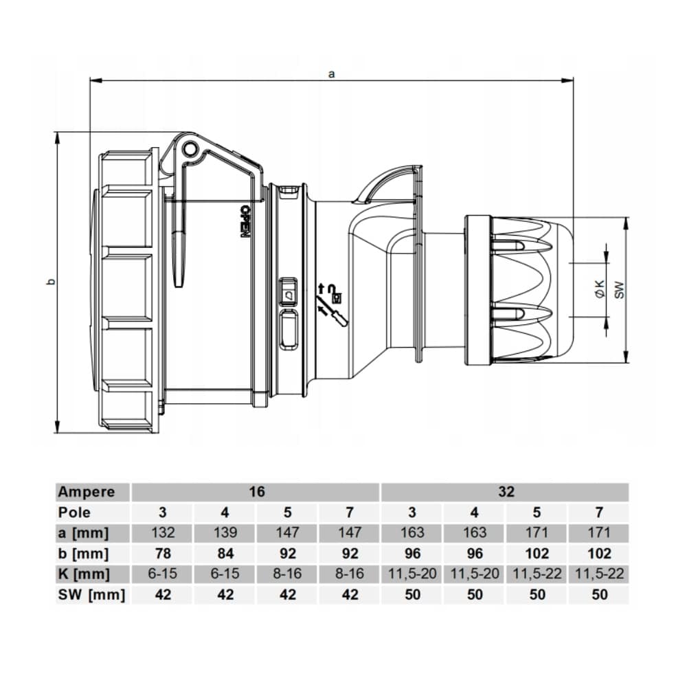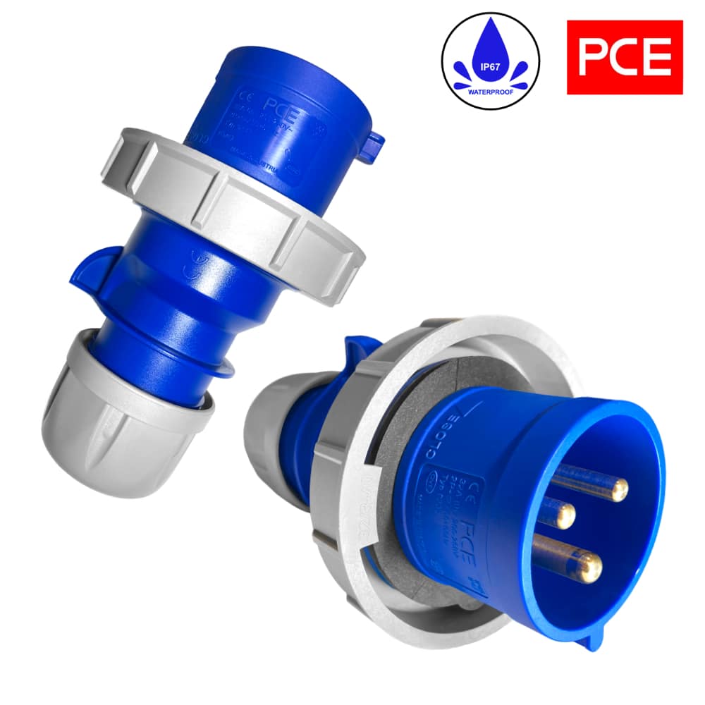 - Wodoszczelność klasy IP 67, gniazda marki PCE – wielokrotnego użytku skręcane nie zalewane, 32A